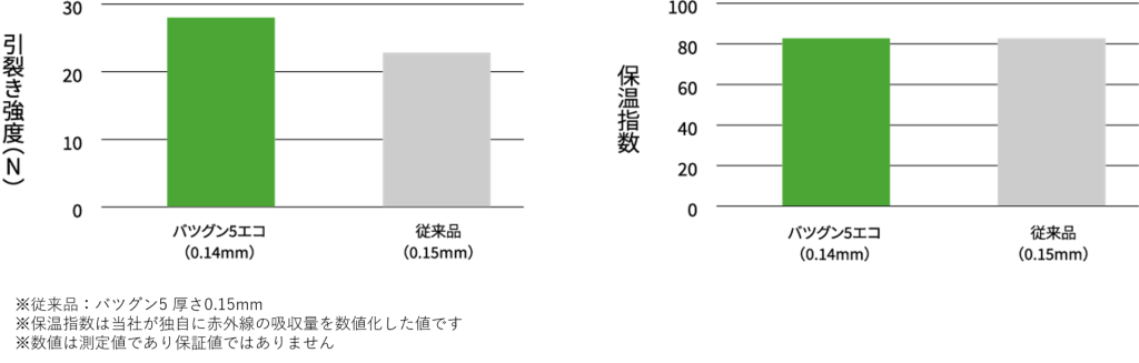 - 引裂き強度、保温指数が従来品0.15mmと同等です。